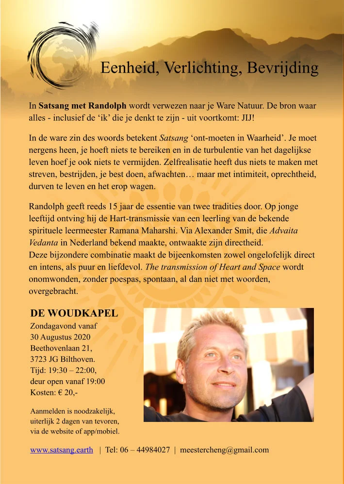 (Daar de satsangs met Randolph nogal direct en best confronterend kunnen zijn, zijn deze bijeenkomsten niet geschikt voor mensen met een psychiatrische aandoening.)